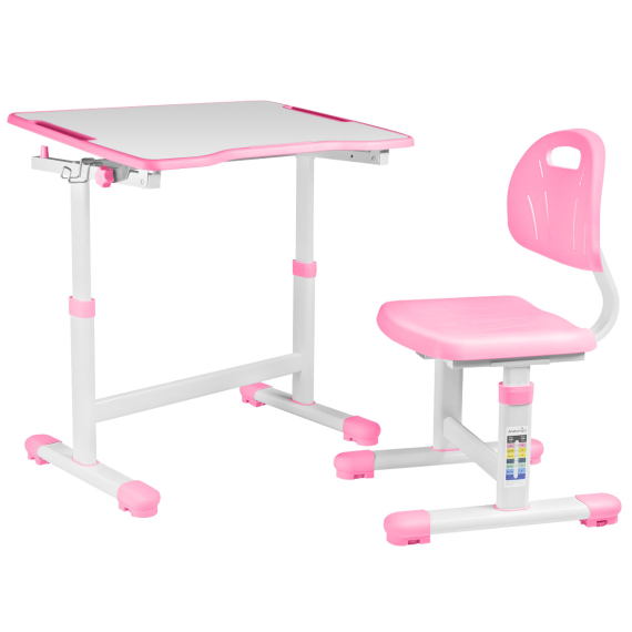 Очень удобный комплект, и стол и стул. Поверхность стола не скользит, есть углубления сбоку для канцелярских принадлежностей, высота стола и стула регулируется, на спинке стула есть отверстие для пеереноса, стол и стул не качаются,при сборке не возникло проблем!Минусы: